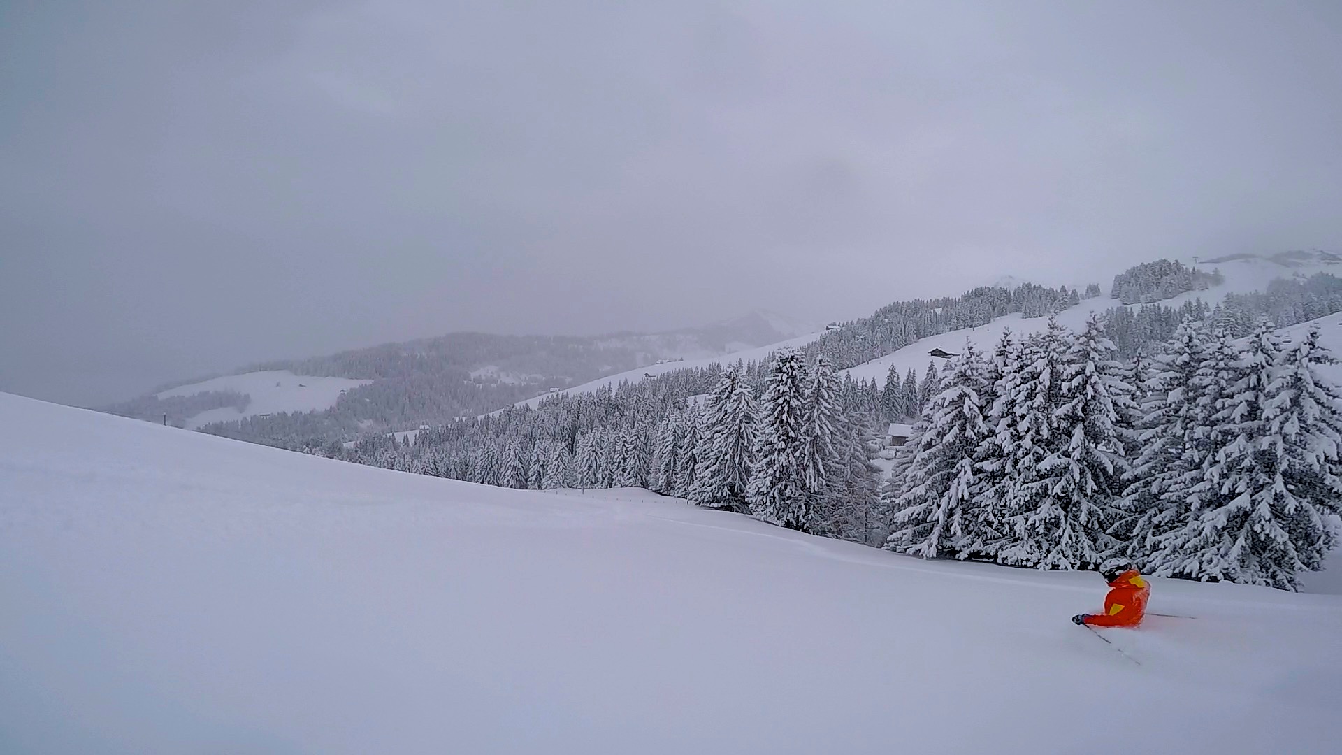 Il a neigé toute la nuit, plus de 50cm de neige fraîche dans la station, le rêve… Une seule installation tourne pour le moment à cause du minage pour sécuriser les liaisons. Cela nous permet de nous chauffer sur cette unique piste, entre quelques sapins…