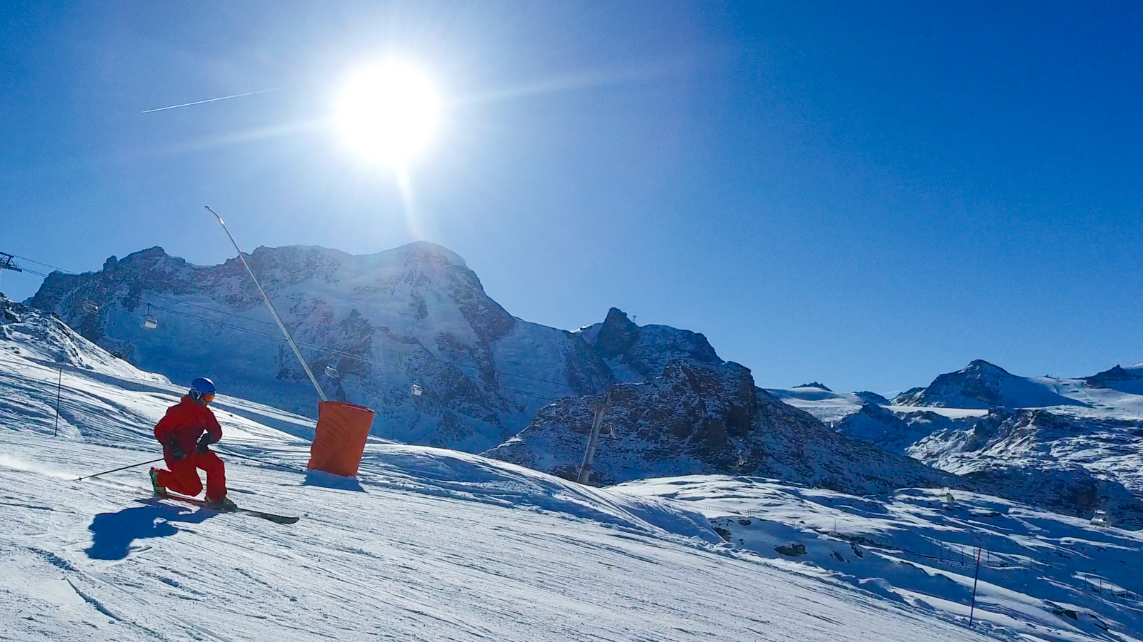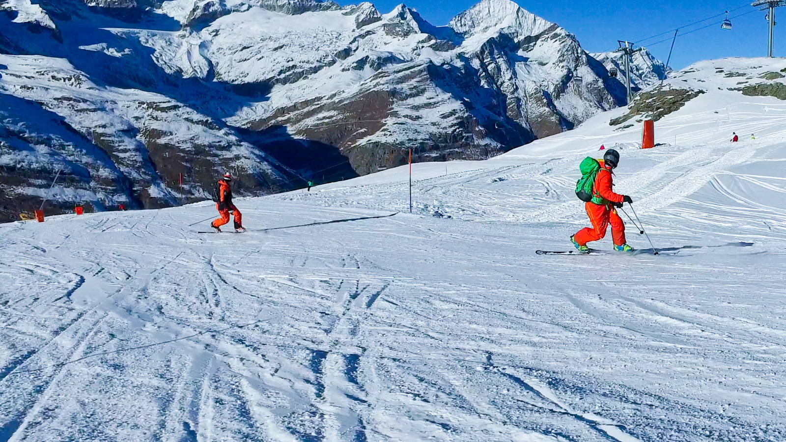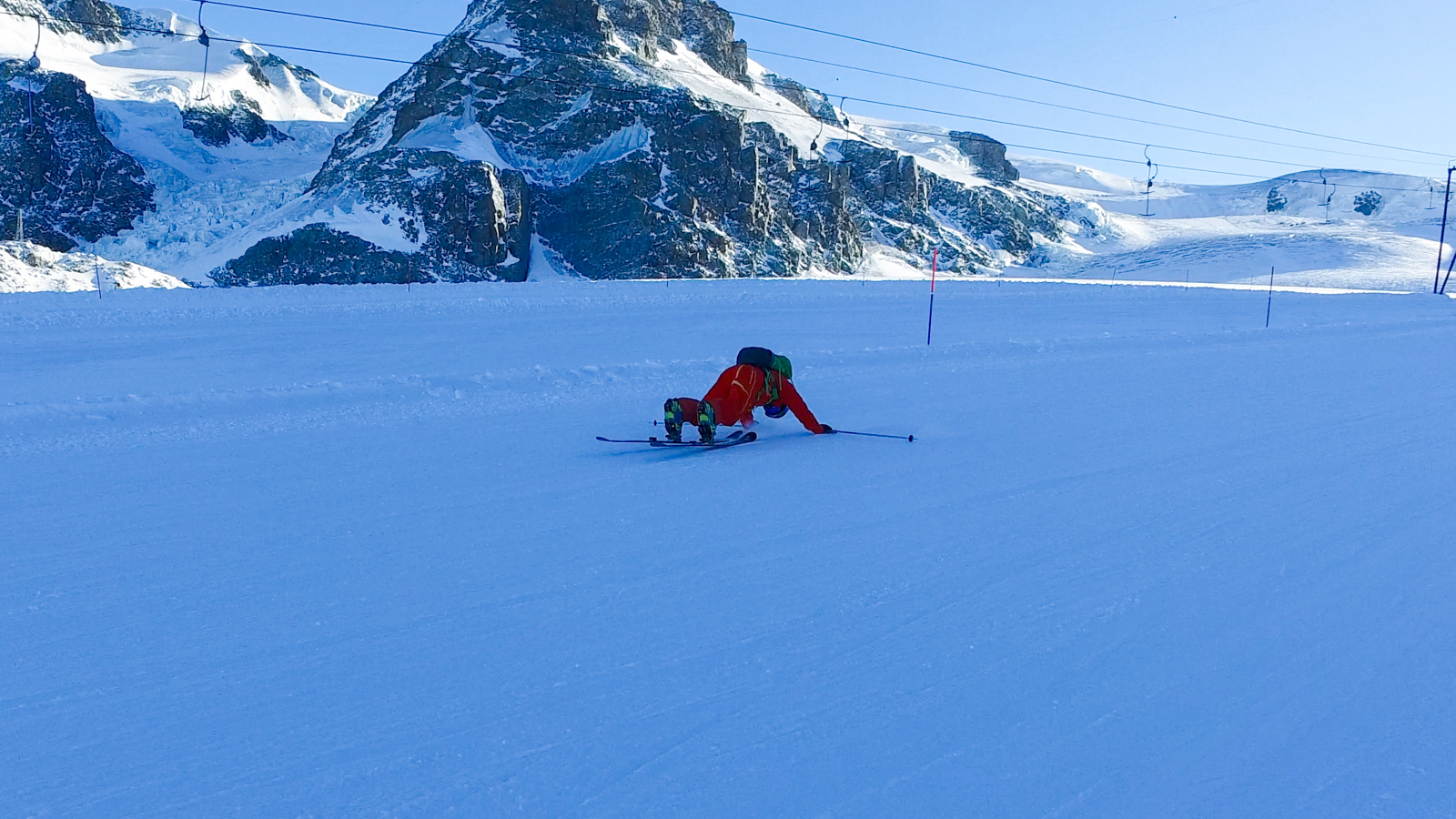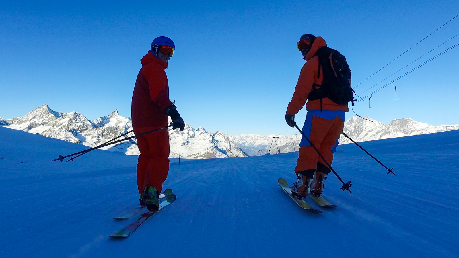 Le lendemain, la météo est toujours avec nous. Nous partons alors tester une autre partie du domaine. Nous réalisons quelques belles prises d’images, le tout avec le sourire et cette vue imprenable sur le Cervin. Un bon moment de passion et de partage.